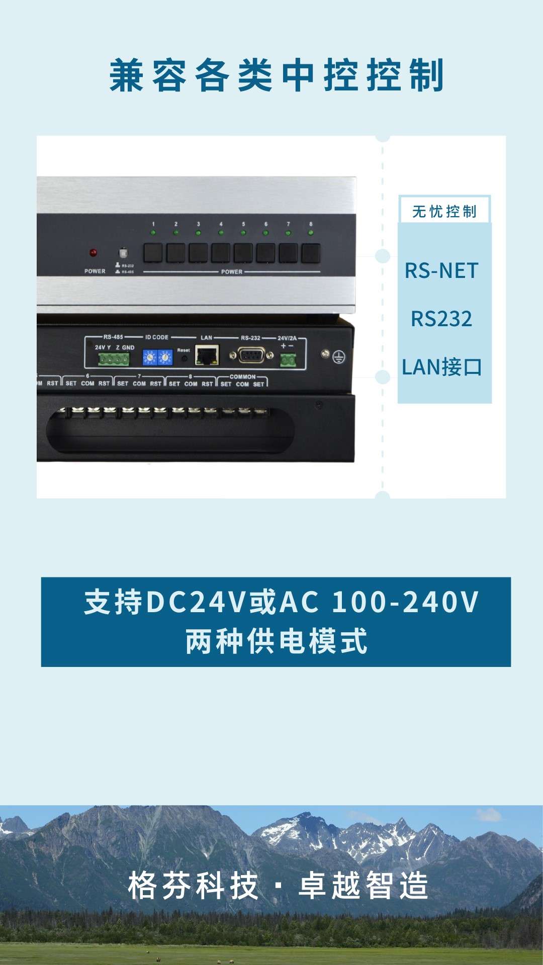GF-SPMS8智能云电源管理器通过LINK协议或者232通信协议与中控主机进行通信,通过继电器原理,达到弱电控制强电的目的,主要运用于控制设备开关,投影机延时关机,电动屏幕、电动窗帘、电动吊架的升降控制等。内置网络控制功能集成WEB GUI界面,随时的通过各种移动设备控制。