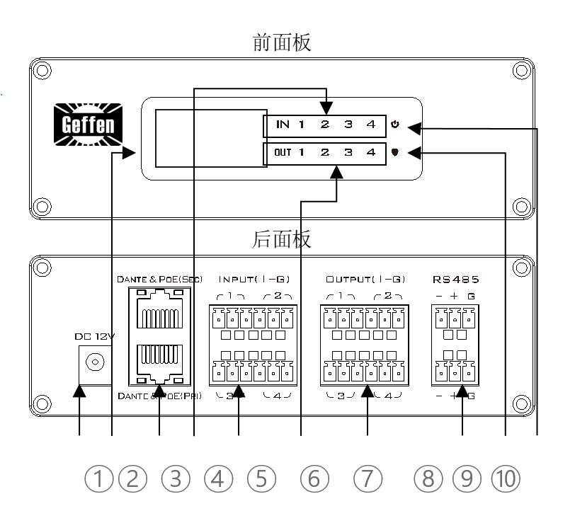 ③ 两路Dante网络接口,支持PoE供电,支持网络级联,可进行PC软件控制。