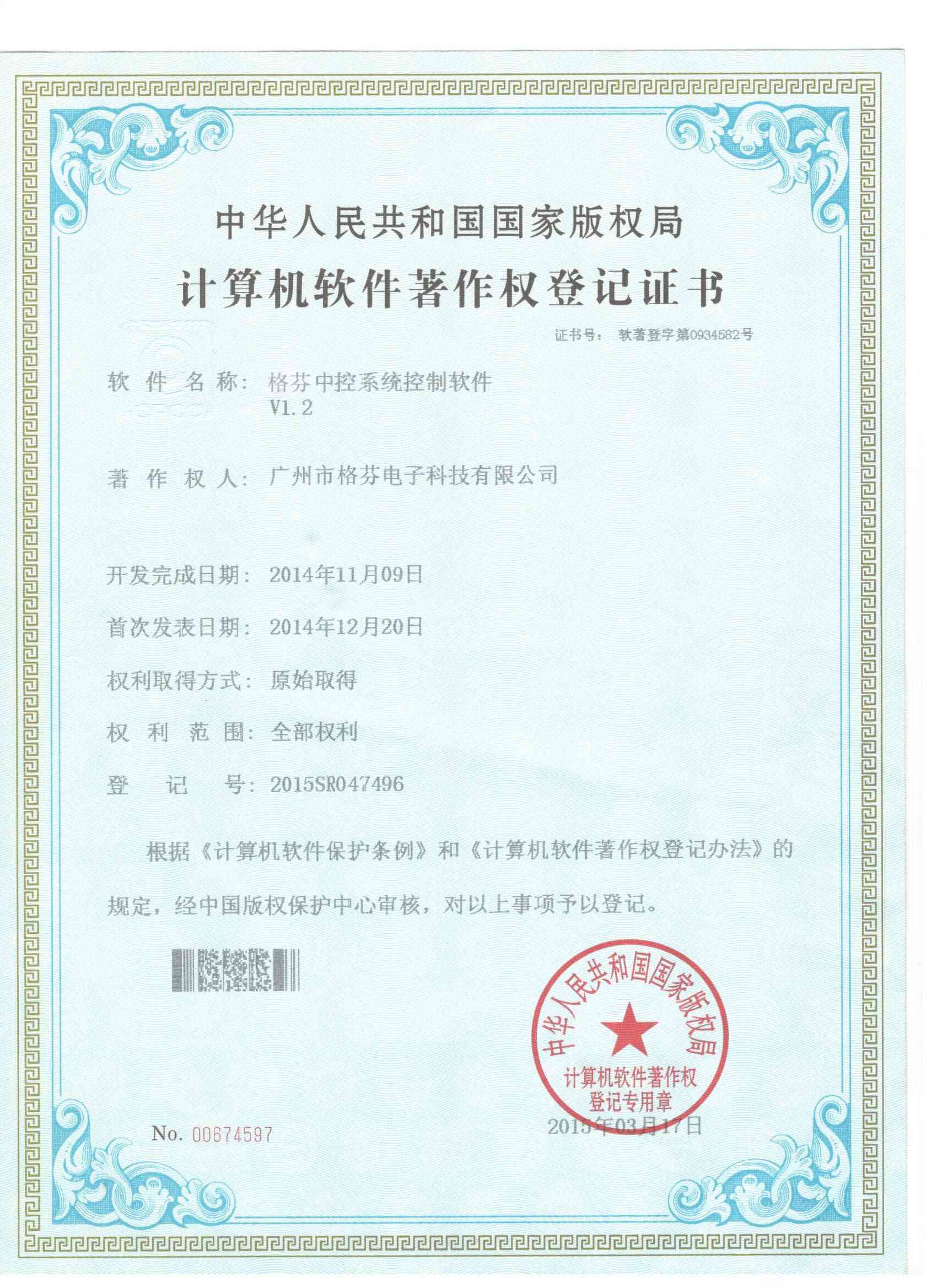 格芬中控系统控制软件著作权登记
