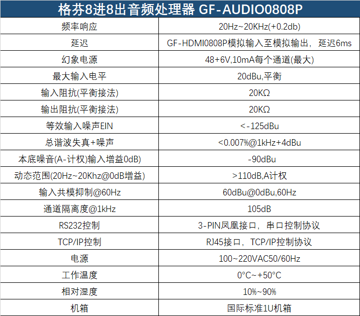 GF-AUDIO0808P音频处理器,还具有高兼容性、控制灵活、操作简单等功能特点,可灵活应用于中、大型网络音频系统,如指挥中心、星级酒店、会议中心、公交枢纽等。