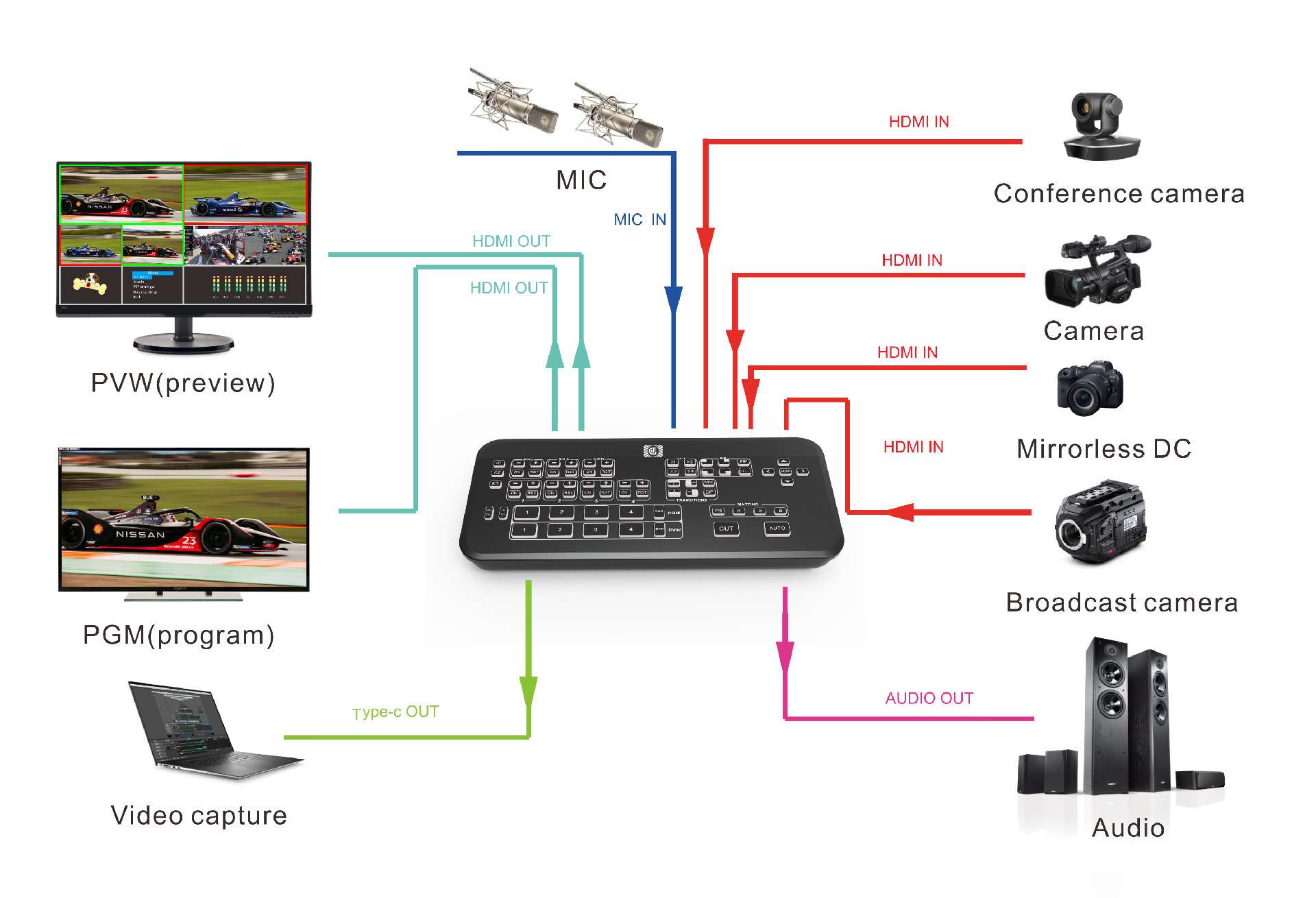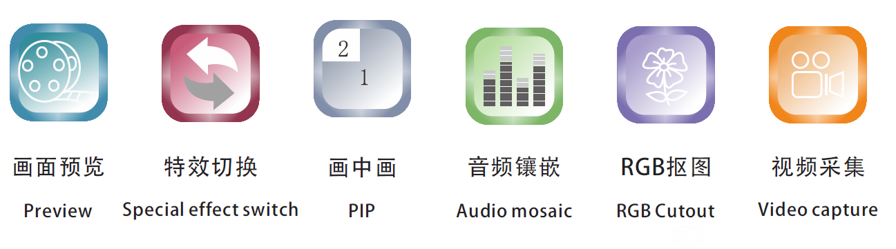 完全满足视频会议, 直播现场, 婚礼婚庆, 广播电视, 节目制作, 户外体育, 教学课程等各类场景的视频切换。