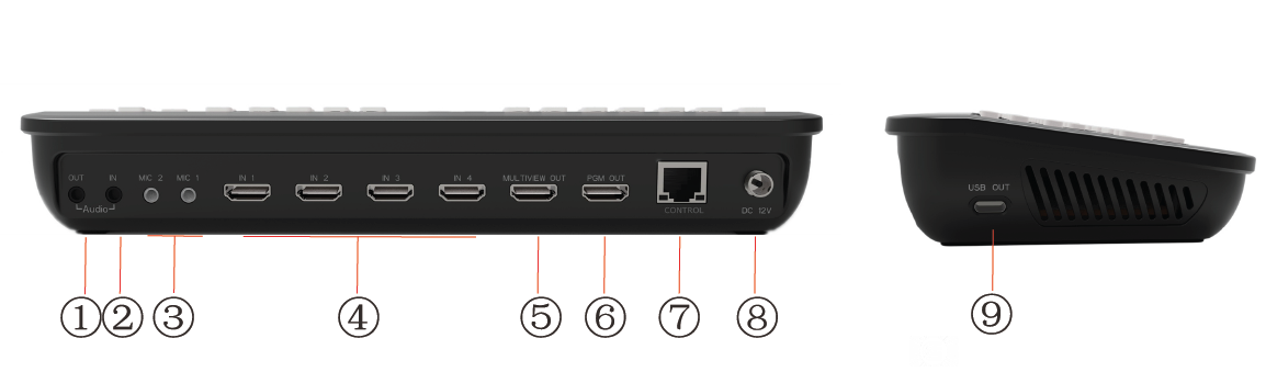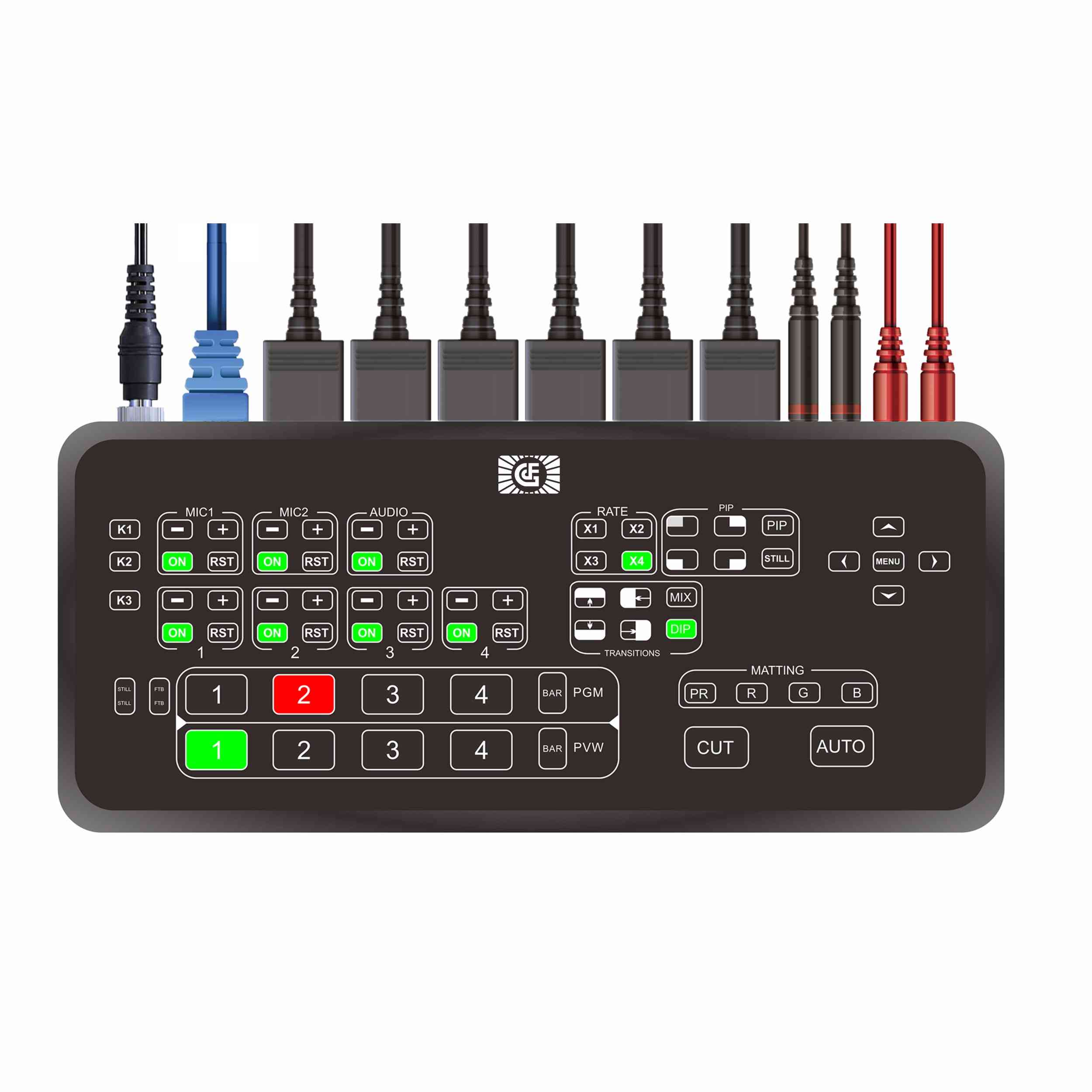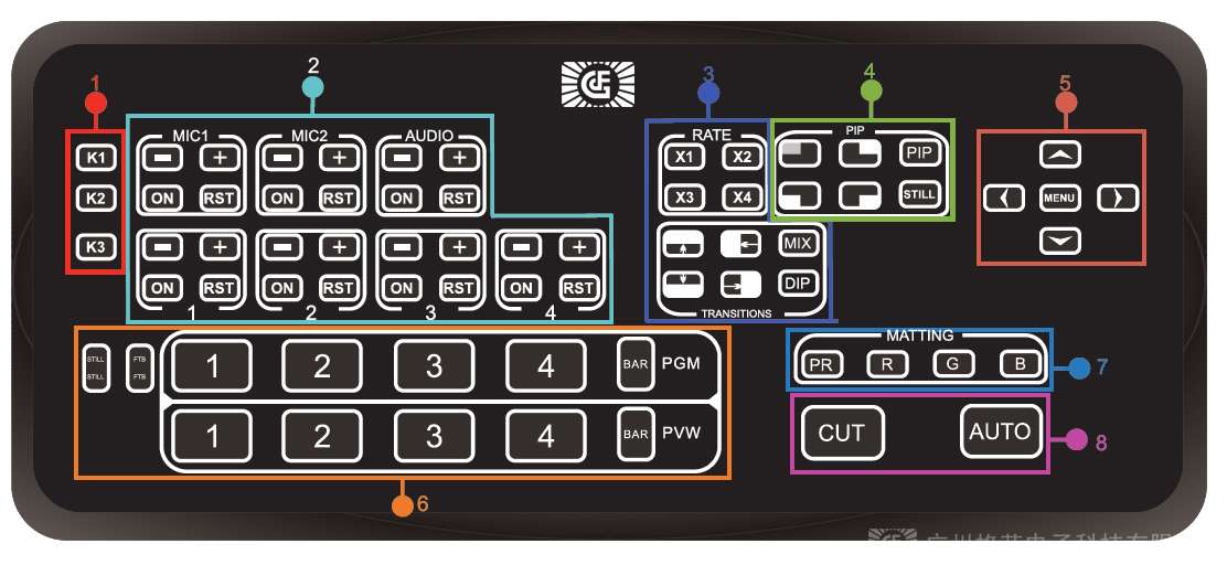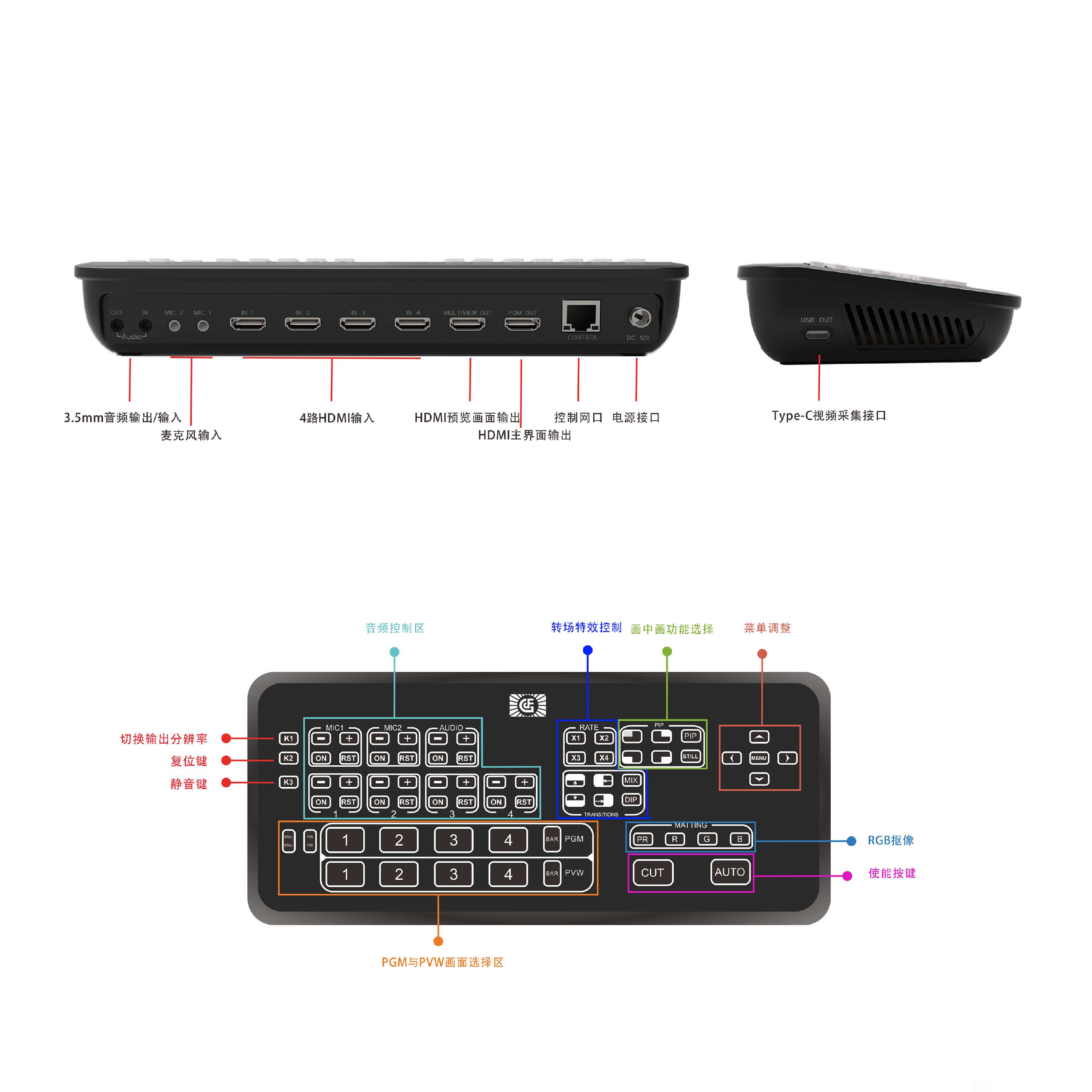 可使用CUT按键画面硬切, 亦可用AUTO按键进行特效转场,转场速度一键调节。