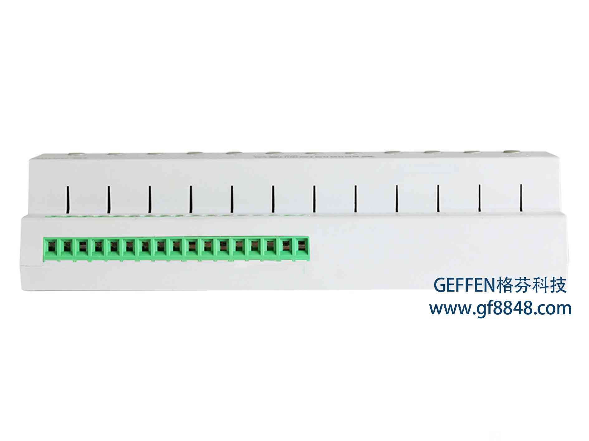 带有12路继电器输出控制,每回路单独控制6600W照明设备的开关,具有每一路的手动控制按键,需要长按1s才可响应,防止误操作的情况发生,对应每路LED指示灯会显示输出状态,另外具有对应每一路的开关量检测接口,每个开关量信号可以定义3种模式,分别是强切,强启,开关 。采用CAN-BUS总线通讯,产品之间需手拉手的方式连接。