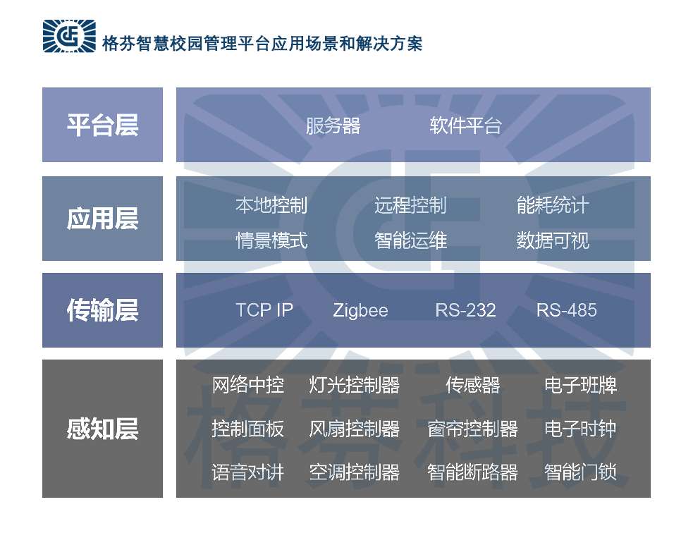 GEFFEN智慧校园管理平台应用场景和解决方案由感知层、传输层、应用层和平台层四部分组成,底层设备通过接入智能终端、传感器等进行统计管理和数据采集,采集数据通过网络采集器网关等通道进行数据回传,回传的数据由平台统一管理展示。