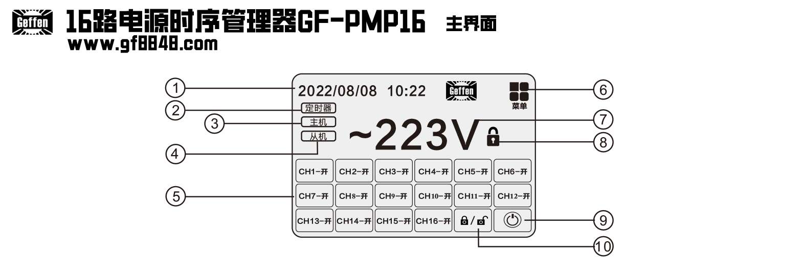 显示屏开关;长按5秒以上,强制关闭 / 开启显示屏和通道,当显示屏在亮屏状态下,短按智能开启 / 关闭通道,绿灯时,表示有通道处于开启状态,红灯时,所有通道处于关闭状态;