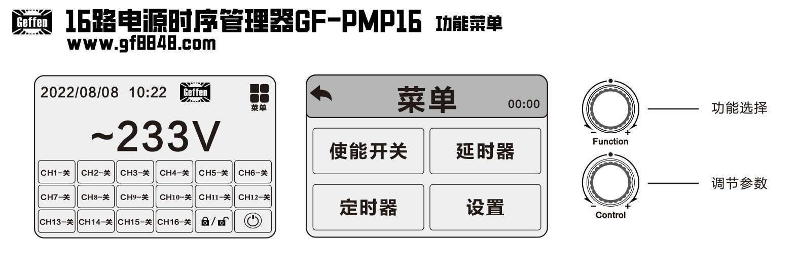 1.通过触屏或旋钮可对时序器所有功能及参数进行设置;