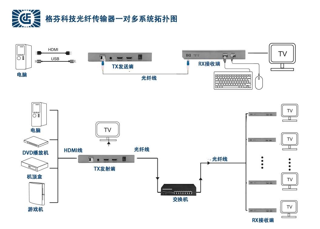 ●HDMI线连接HDMI信号源与HDMI 发射端。 ●HDMI线连接HDMI 接收端与显示设备。 ●光纤线代替HDMI线将延长器的发射端的光纤接口和接收端的光纤接口连接起来,最长可传输20km。 ●将5V电源接到设备上,对设备供电此时视频传输设备的 POWER 灯亮,当Link灯亮,设备启动正常。