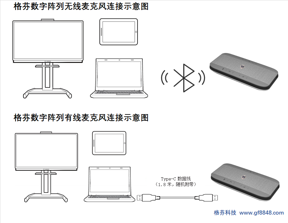 支持三种连接方式,USB即插即用、3.5mm音频线外接终端、蓝牙无线传输(蓝牙适配器有效连接距离10米,手机连接最大距离30米)。免驱动使用,兼容视频会议系统、多媒体通信系统、网络会议平台,可实现在任何场景下的快速部署,随时随地开启远程通信。