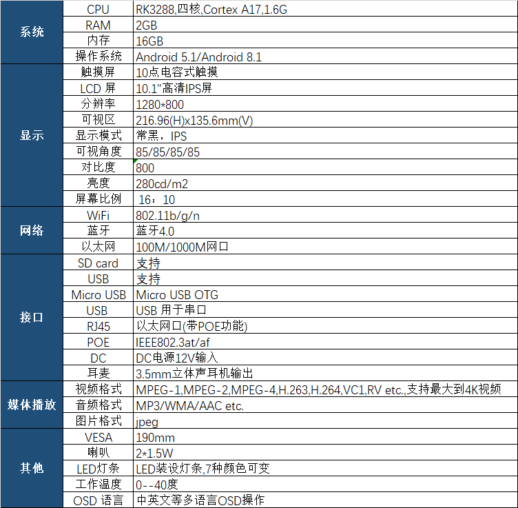 ●Wi-Fi802.11 a/b/g/n/ac (RK3399 ),W-Fi802.11b/g/n (RK3288/3566/3568)蓝牙4.2
